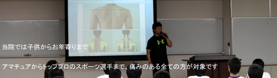 ⇒ 学校講師で前阪神タイガース臨時トレーナー、アスリート専属契約トレーナーの院長がお待ちしております。体の痛みはもちろん、スポーツに伴う疾患にも対応しますので是非ご相談ください。 |