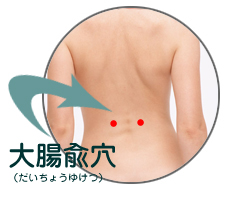東洋医学でも便秘は大腸の経絡、胃の経絡、肝の経絡、脾の経絡など種々の経絡バランスの乱れによって種類も分類され、顔や口のまわりが荒れて吹きでものが出る現象は便秘由来のものが多く、これは大腸の経絡の乱れやアンバランスにより起こるものです。大腸の経絡が原因で便秘している方は、大腸兪穴、合谷穴をとりましょう。大腸兪は第4・5腰椎間の外方3センチに、合谷穴は手の親指と第2指のつけ根にそれぞれとります。