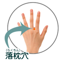 落枕穴は手の甲で、人差し指と中指の間で、指の第3関節より1センチほど手首側に、落頚穴は首すじで耳タブより約3cm下にそれぞれとります。